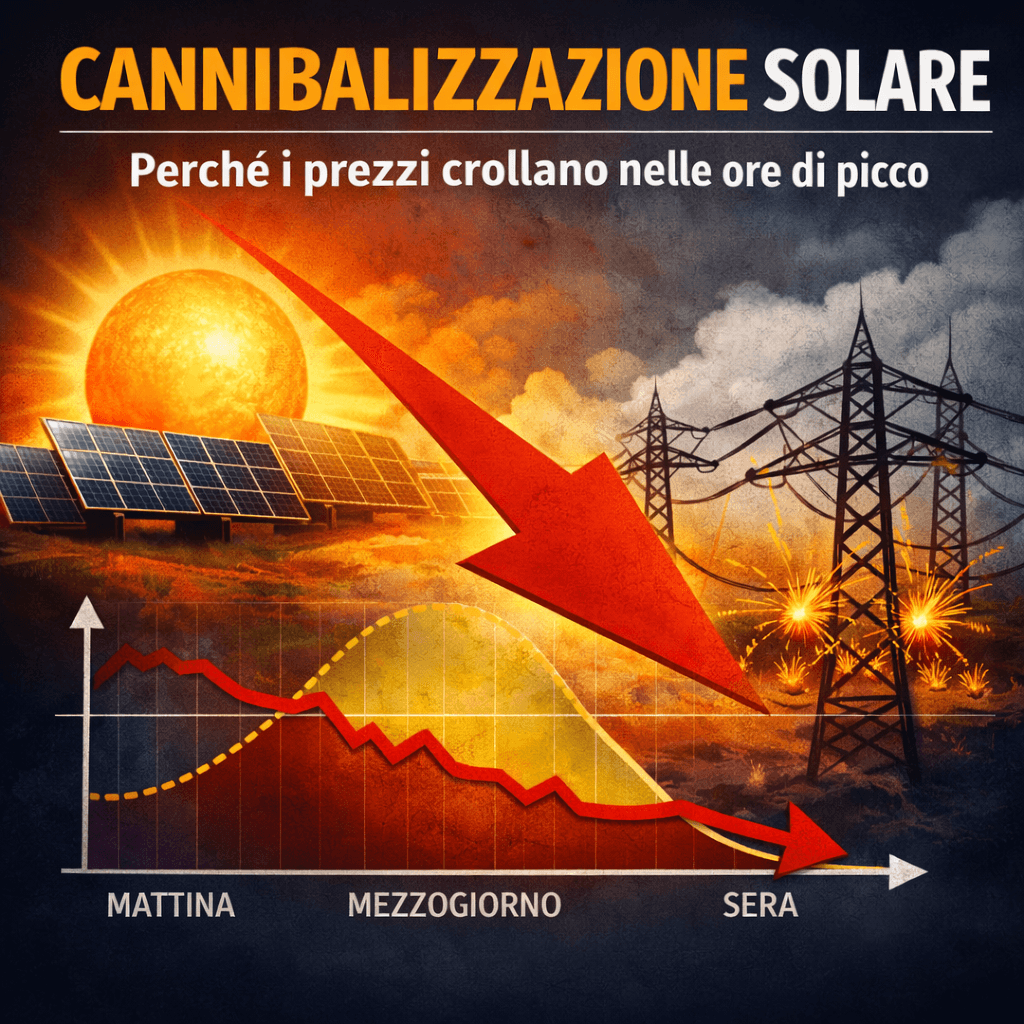 Negli ultimi mesi molti operatori ci hanno segnalato un fenomeno ricorrente: impianti fotovoltaici che producono più del previsto, ma ricavi che scendono nelle ore centrali. È l’effetto della cannibalizzazione solare, un tema che in Italia non viene quasi mai chiamato per nome, ma che è già descritto chiaramente nella nostra analisi, disponibile nella nostra Guida Fotovoltaico 2026. Il punto è semplice: quando troppa energia solare entra in rete nelle stesse ore, il prezzo dell’energia crolla. E questo accade anche se il mercato italiano, per struttura regolatoria, non mostra prezzi negativi come avviene in altri Paesi europei. Il risultato è un paradosso: più fotovoltaico installiamo, più il valore dell’energia nelle ore solari si abbassa, con impatti diretti sui PPA e sulla redditività degli impianti utility scale.